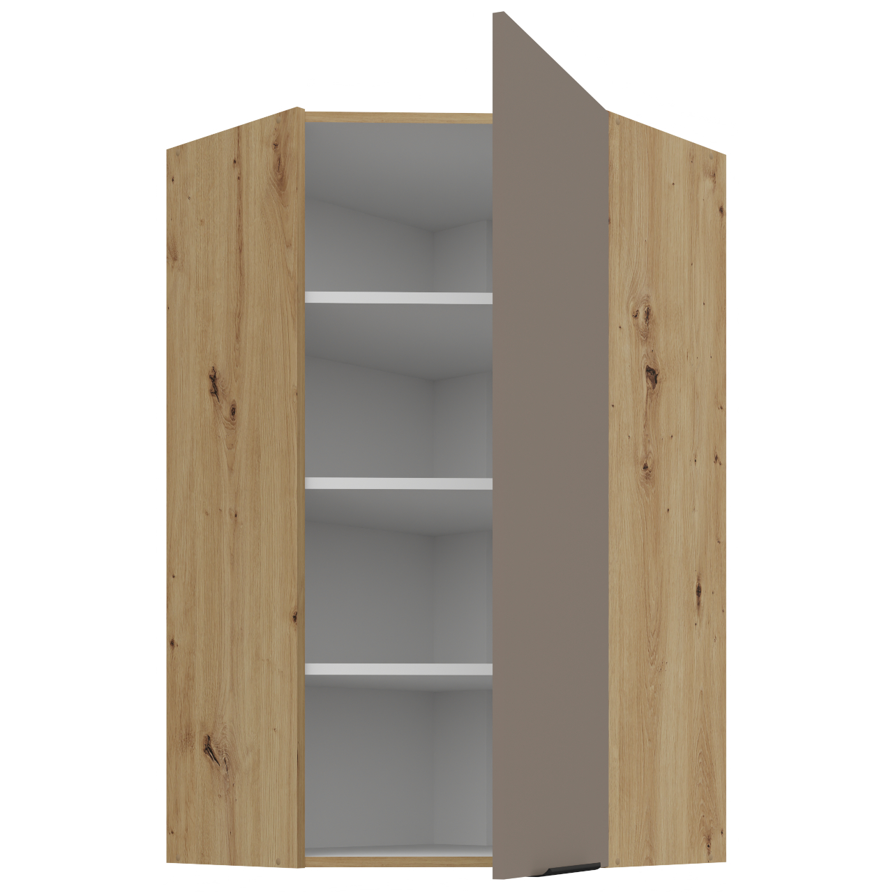 Innenraum des Schranks in weiß. Der Schrank hat drei Einlegeböden. Die griffbohrungen sind blind gebohrt. Tür im Winkel montiert 45°. |
